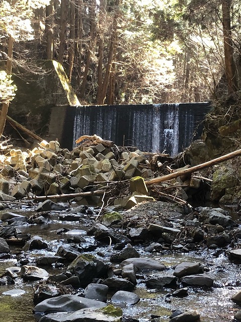 1時間もしないですぐに堰堤が現れました。その間に岩のえぐれの下から飛び出したイワナをキャッチ、写真撮る前にオートリリースさようなら。
