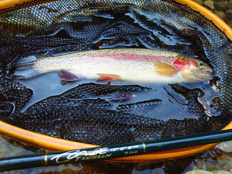 最初の1匹は、フライをひったくるようなアタリで、スイングで食わせました。